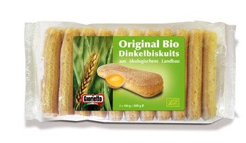 Špaldová múka* 30%, trstinový cukor*, VAJCIA* 26%, zemiakový škrob*, PŠENIČNÝ škrob*, MLIEČNE bielkoviny*, kypriaci prášok: uhličitan sodný, uhličitan amónny, vanilková aróma*; *zložka z biologického hospodárstva